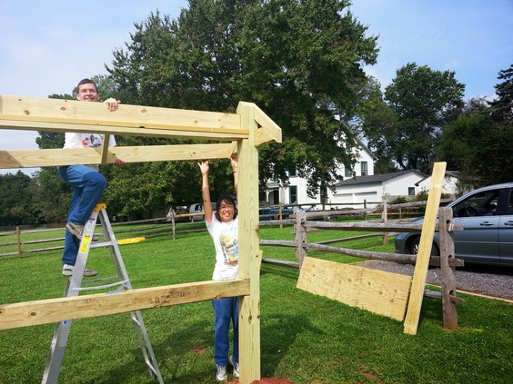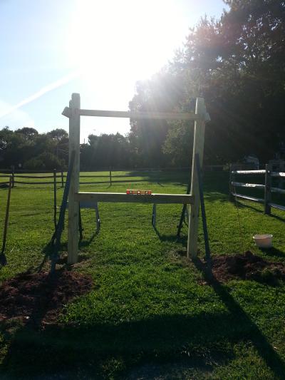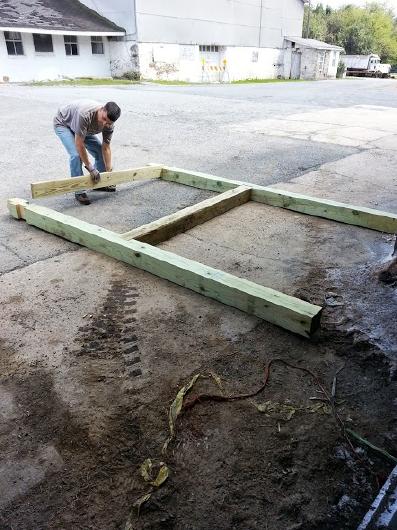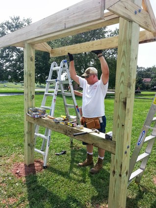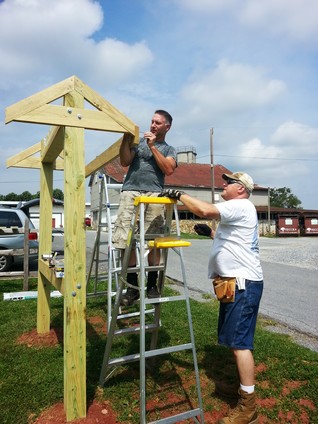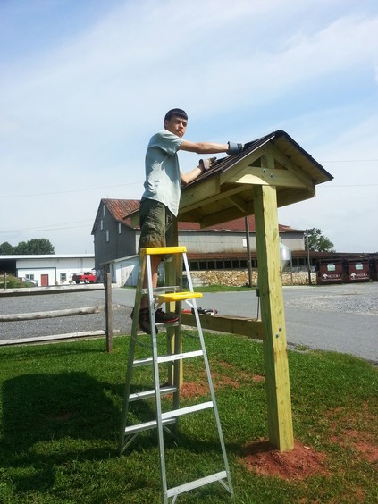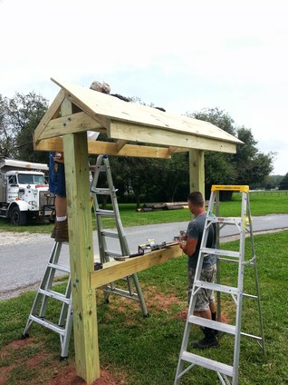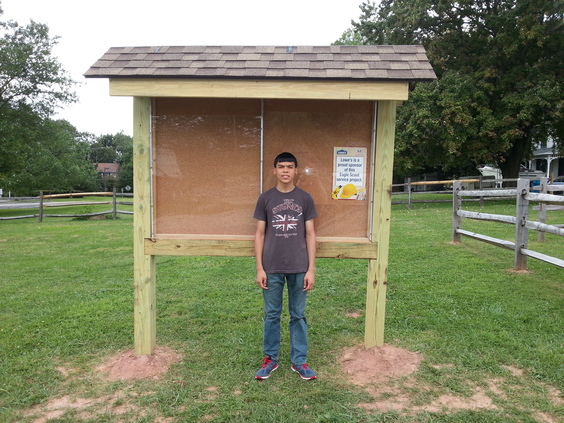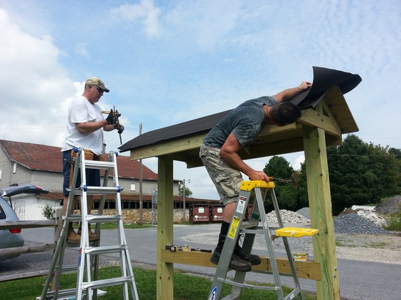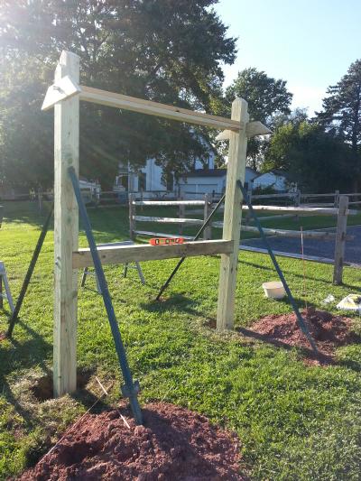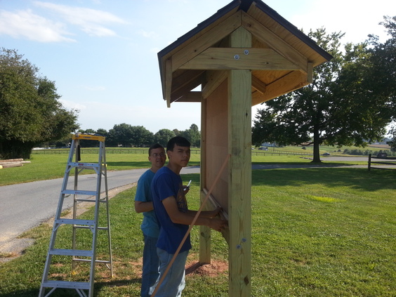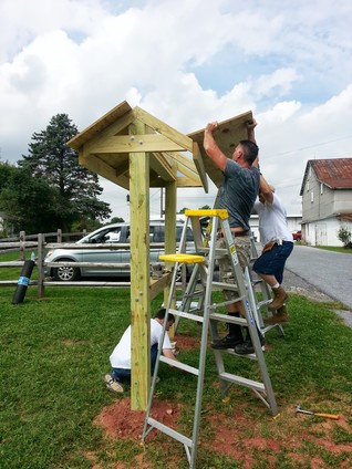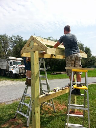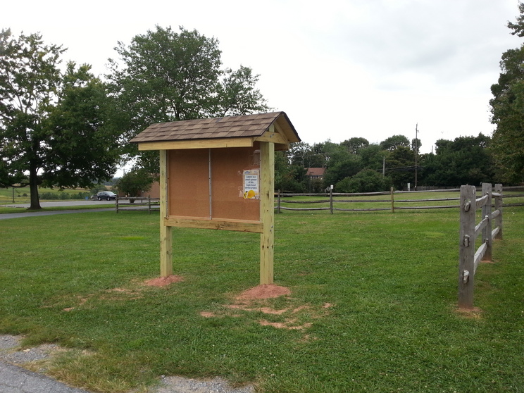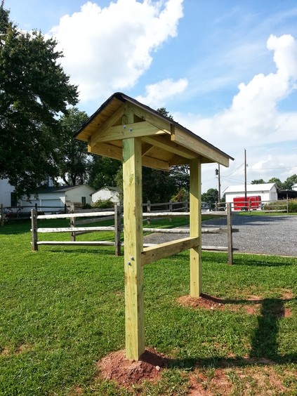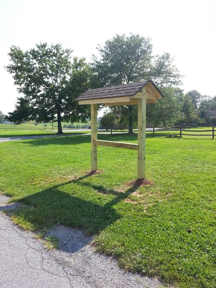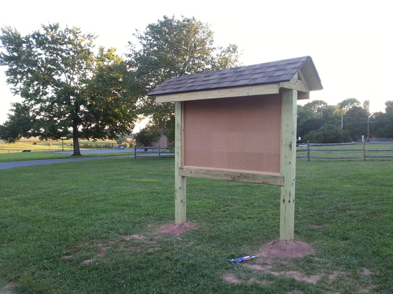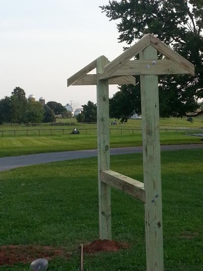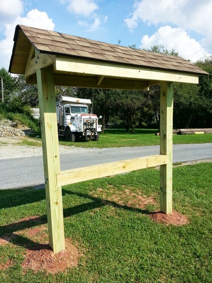 To announce public events, Franklin Township wants a free-standing bulletin board. It's based on the Appalachian Trail plans but is scaled down. For instance, the Appalachian Trail uses 10" x 10" posts and this one uses 6" x 6". Even at that, working with heavy, pressure treated wood is difficult. The end-posts are 12' long with about 3.5' underground.