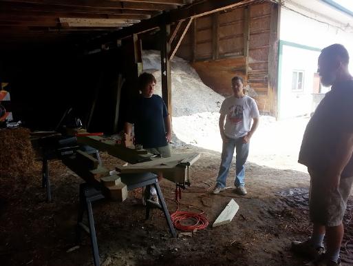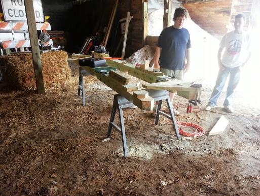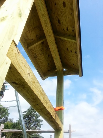 ![]() Fitting truss members & escaping the hot sun. | ![]() More truss work. Notice angled notches at top. | ![]() Wow, they fit! |