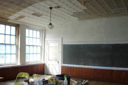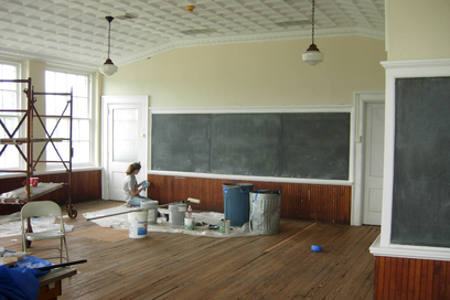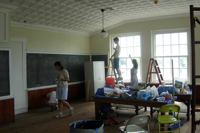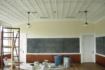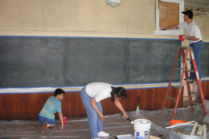 ![]() Tape removed, 1st coat of wall paint | ![]() Elise washing wainscoating after 2nd coat of wall paint | ![]() View of front of classroom |