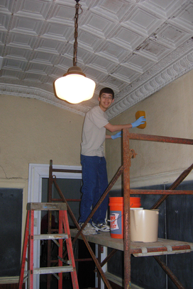 ![]() Sanding complete | ![]() Ceiling wirebrushed | ![]() Ceiling wirebrushed |