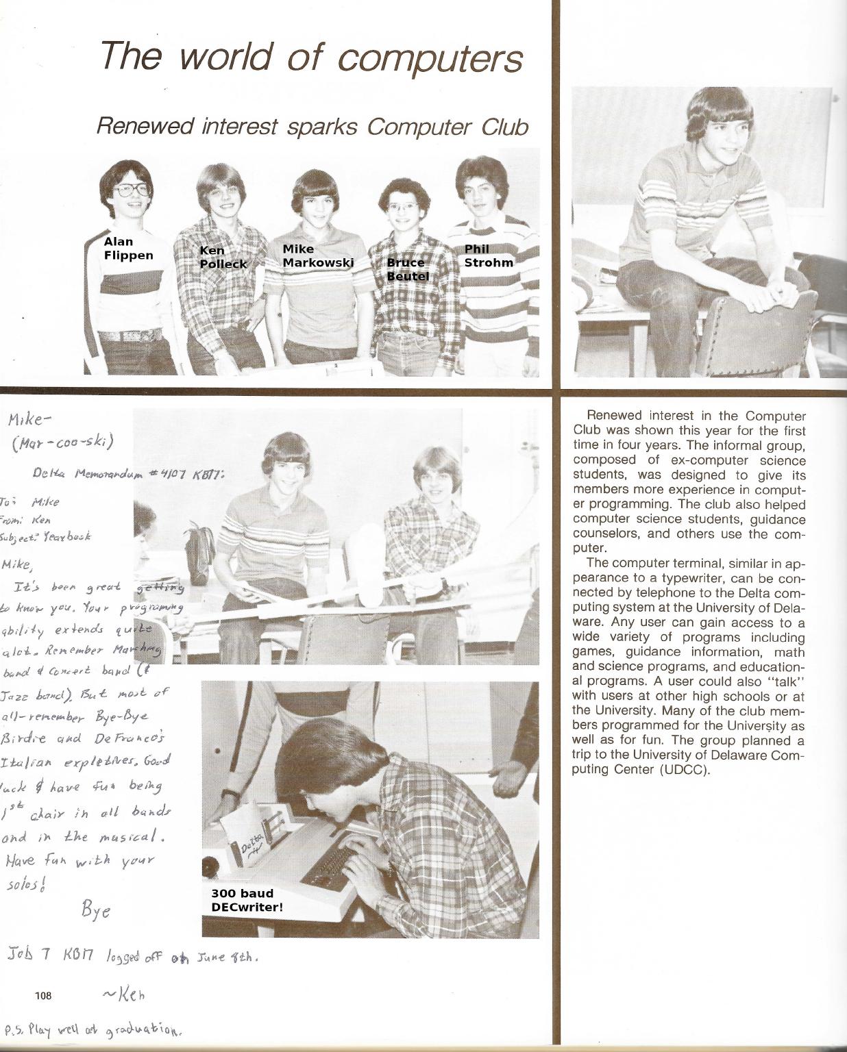 To the right is a picture of our club from the 1980 Mt. Pleasant High School year book, probably taken in fall 1979. (I wasn't making the barber rich.) Click on the photo for a bigger version and notice the lightening fast 300 baud DECwriter. That was the entire physical side of the computing experience then, and it was fantastic.