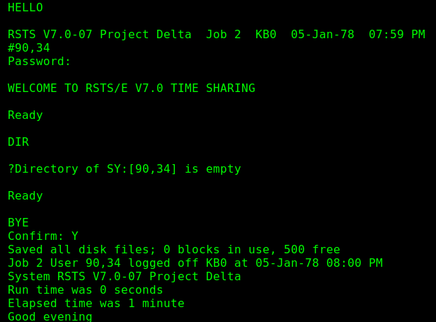 I updated ACCT.SYS with the Project Delta version from 1979 to give it the right feel. :-) Now, I need to read because decades of Unix seem to have mostly supplanted my RSTS/E know-how! Unfortunately, no back ups were made of the Project Delta machine before it was shut down forever, so this is a shadow the heavily modified RSTS/E OS that was Delta but still great of fun. There are some programs written by Delta staff members at DECUS RSTS-11 Library Entries.