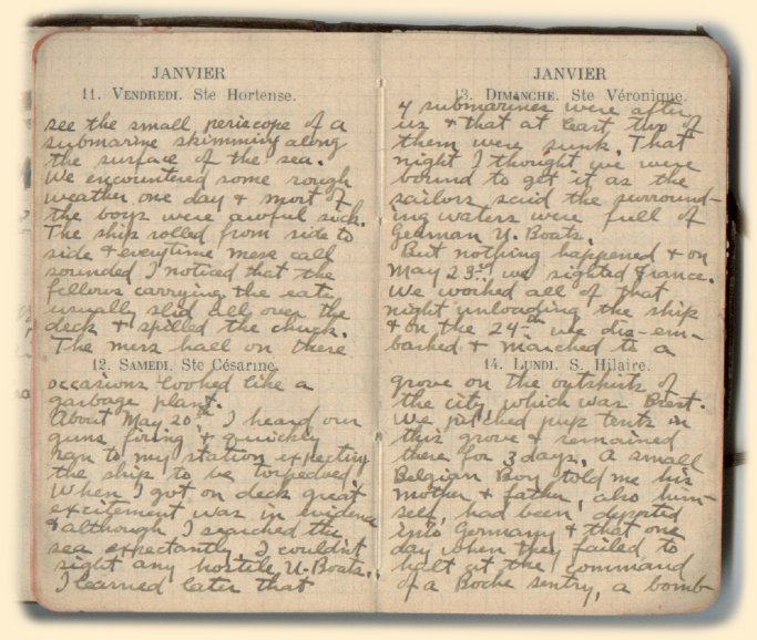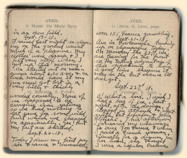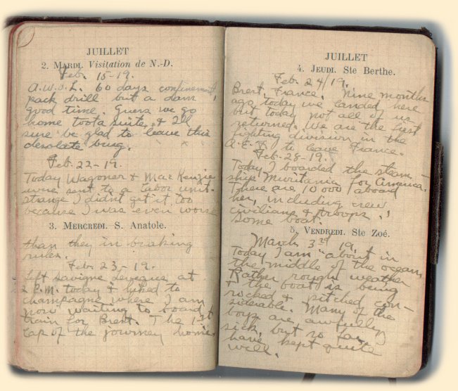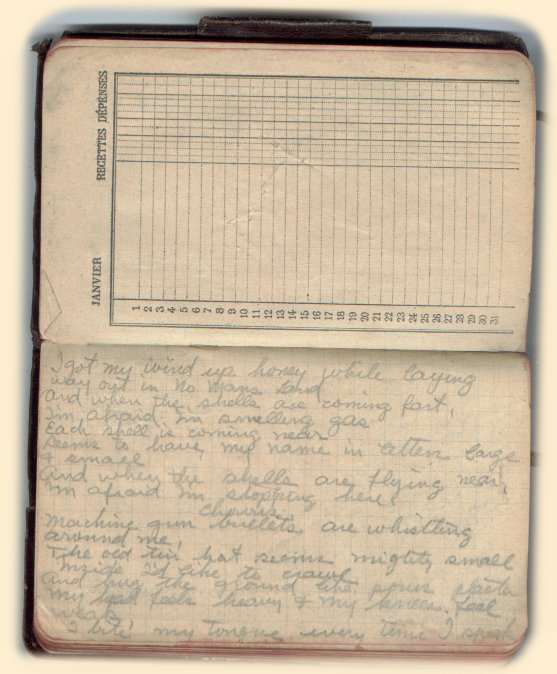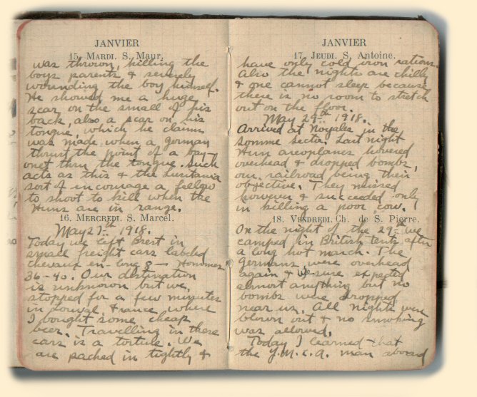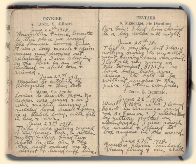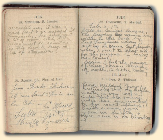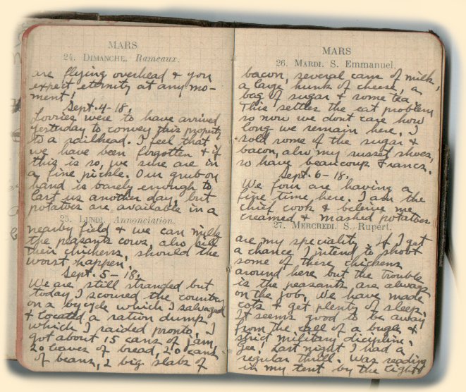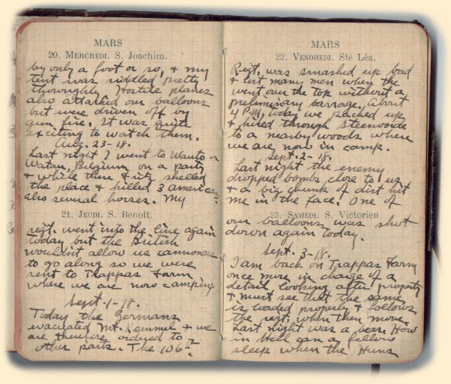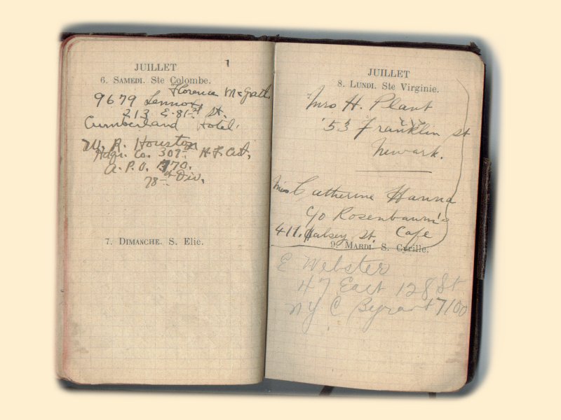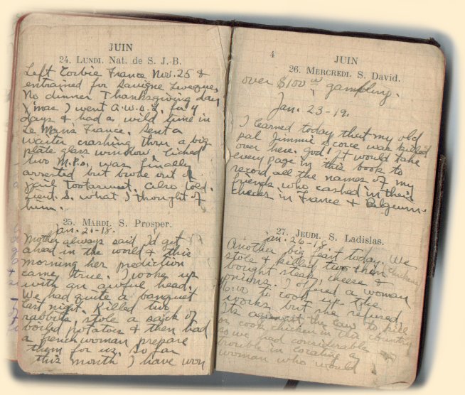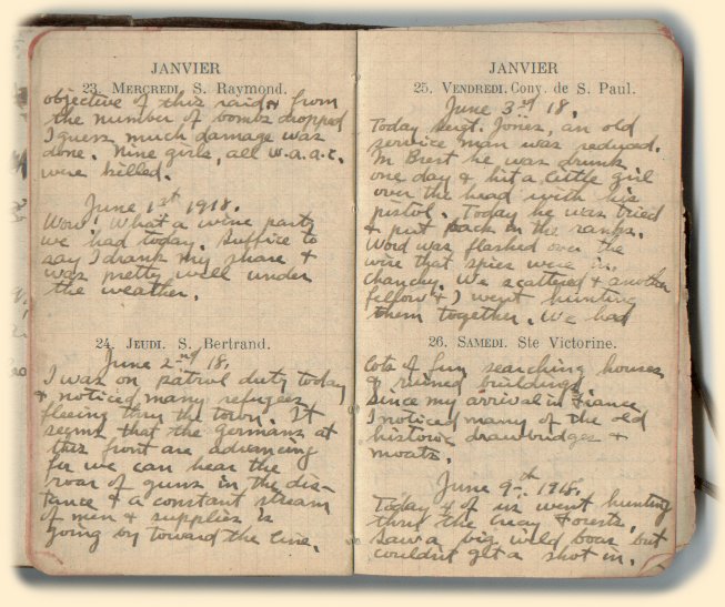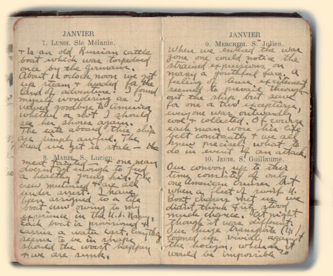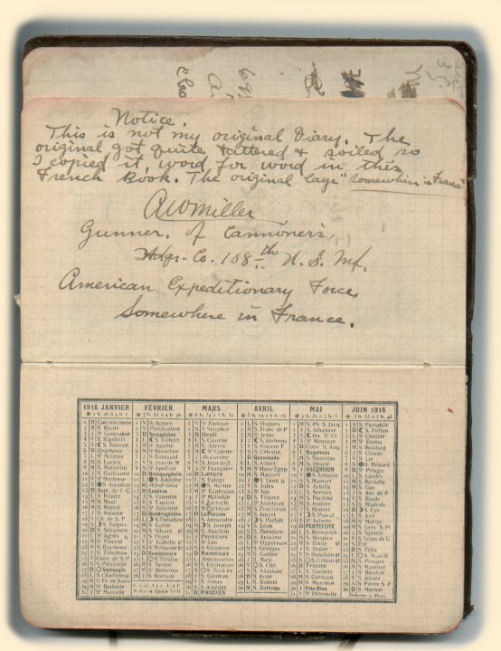(Apologies for the rough formatting of this page. I'm clearly not a web designer and welcome ideas for improvement!) My mom, Evelyn Marvel (maiden name), had an Uncle Paul on her mother's side. When my Uncle Paul died one of his possessions was the diary you are about to read. My mom doesn't know who A. W. Miller is - distant relative, friend of Paul? A little genealogy is in order. I have had the diary since my teenage years, and hadn't read it probably since first receiving it. My 12 year old son (2006), however, loves history. He can't get enough of it. When he learned of the diary, he excitedly asked to read it. To better preserve it, though, we decided to carefully scan it in. The original scans are much larger than the ones shown on the following web pages. While Mr. Miller points out that this is a copy of his original diary, it seems that he copied it partway through his time in Europe. Later pages contain names and addresses written by people he met in France, and the names are mentioned in the next diary entry. So at least a portion of the diary must be original. But I can't help wondering if his first diary is the hands of a family in France... After scanning, I typed the script preserving linebreaks, misspellings, typos, and so on. I am all too human, however, and have probably introduced an error or two. Feel free to point any out that you discover! We are also very interested in any information that might tie other people to Mr. Miller, as well as any general comments or thoughts you might want to share. Thanks! |
