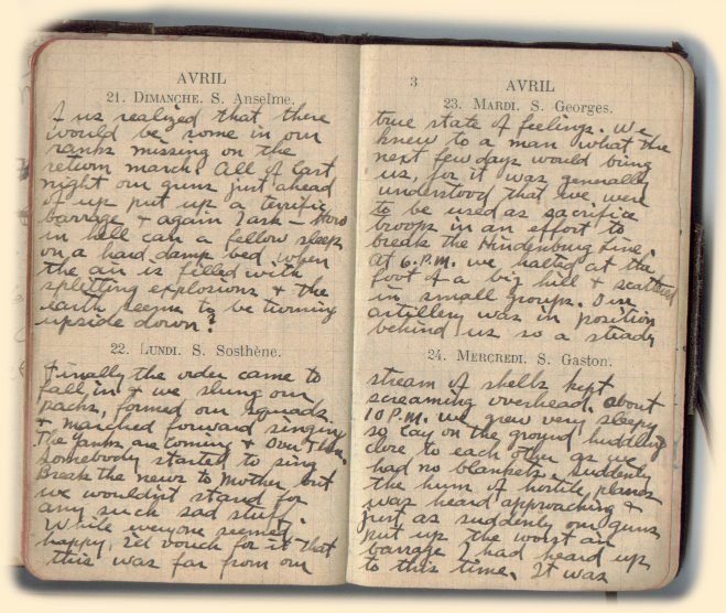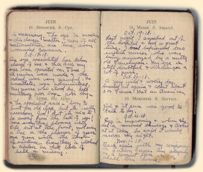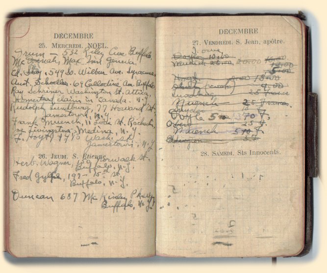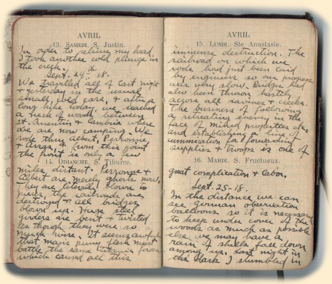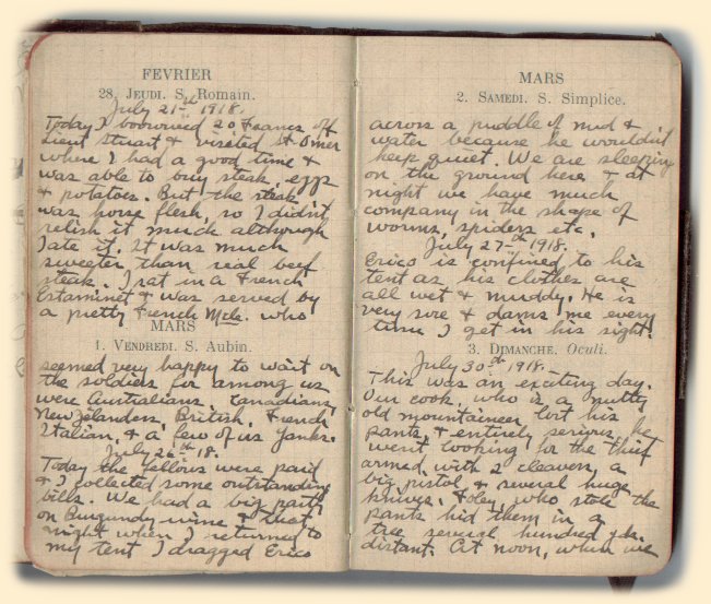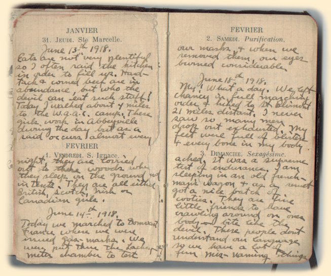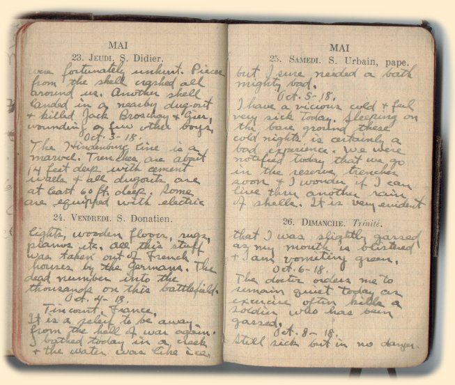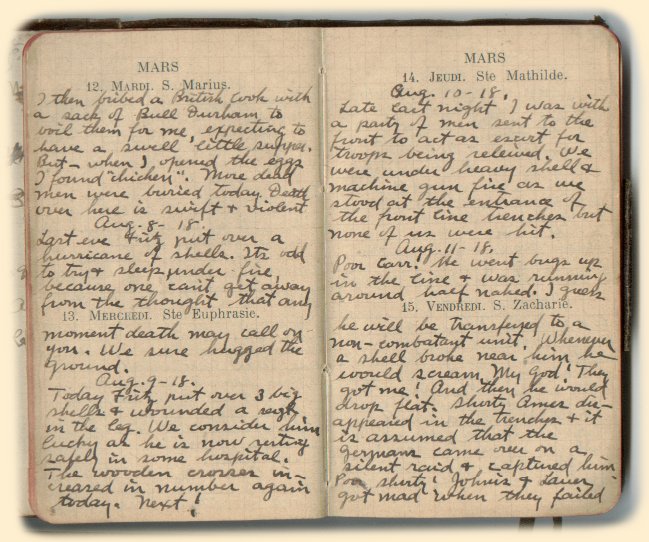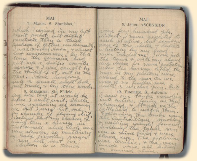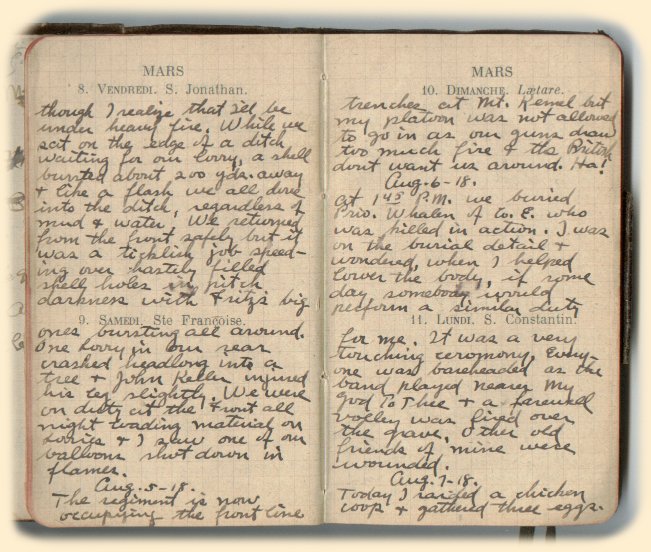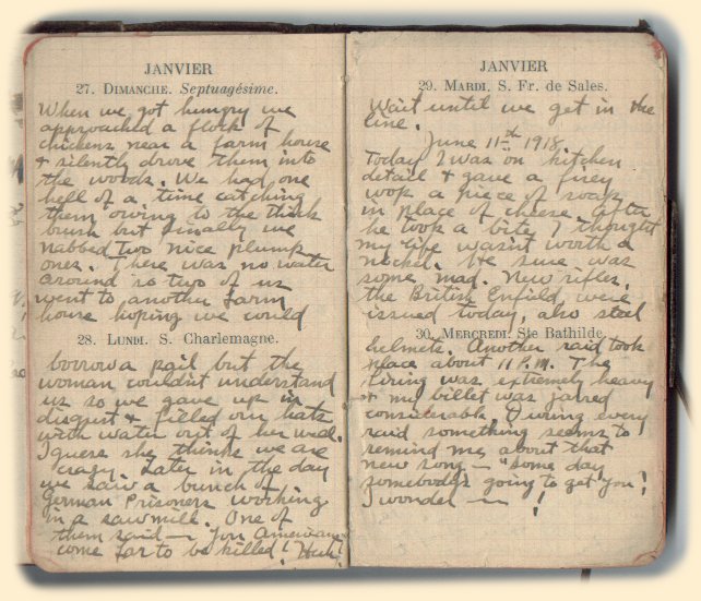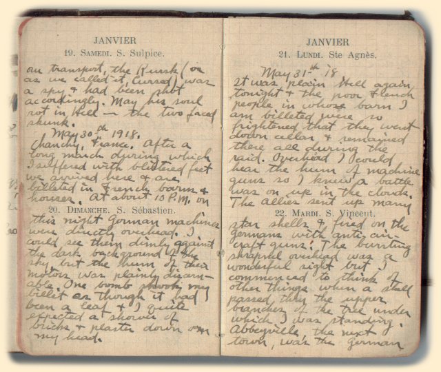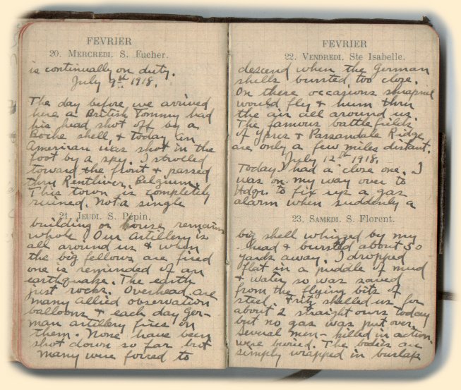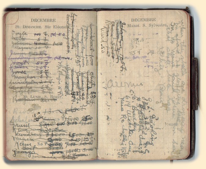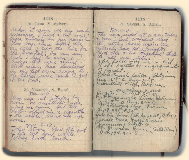(Apologies for the rough formatting of this page. I'm clearly not a web designer and welcome ideas for improvement!) My mom, Evelyn Marvel (maiden name), had an Uncle Paul on her mother's side. When my Uncle Paul died one of his possessions was the diary you are about to read. My mom doesn't know who A. W. Miller is - distant relative, friend of Paul? A little genealogy is in order. I have had the diary since my teenage years, and hadn't read it probably since first receiving it. My 12 year old son (2006), however, loves history. He can't get enough of it. When he learned of the diary, he excitedly asked to read it. To better preserve it, though, we decided to carefully scan it in. The original scans are much larger than the ones shown on the following web pages. While Mr. Miller points out that this is a copy of his original diary, it seems that he copied it partway through his time in Europe. Later pages contain names and addresses written by people he met in France, and the names are mentioned in the next diary entry. So at least a portion of the diary must be original. But I can't help wondering if his first diary is the hands of a family in France... After scanning, I typed the script preserving linebreaks, misspellings, typos, and so on. I am all too human, however, and have probably introduced an error or two. Feel free to point any out that you discover! We are also very interested in any information that might tie other people to Mr. Miller, as well as any general comments or thoughts you might want to share. Thanks! |