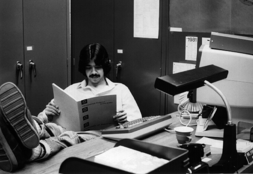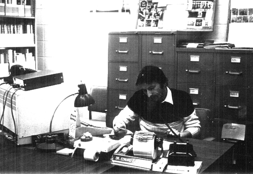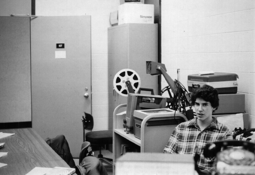 This seems to be David Arenson from Brandywine High School. We are not sure why he is waiting around in Ed Boas's office. Notice the acoustic coupler on the right. After the move out of DuPont Hall, access at anything over 300 baud was a rare luxury. The movie projector and A/V equipment seem to mock the student. In Willard Hall, this was about the full extent of the "hardware" that most Delta staff would have the opportunity to see.