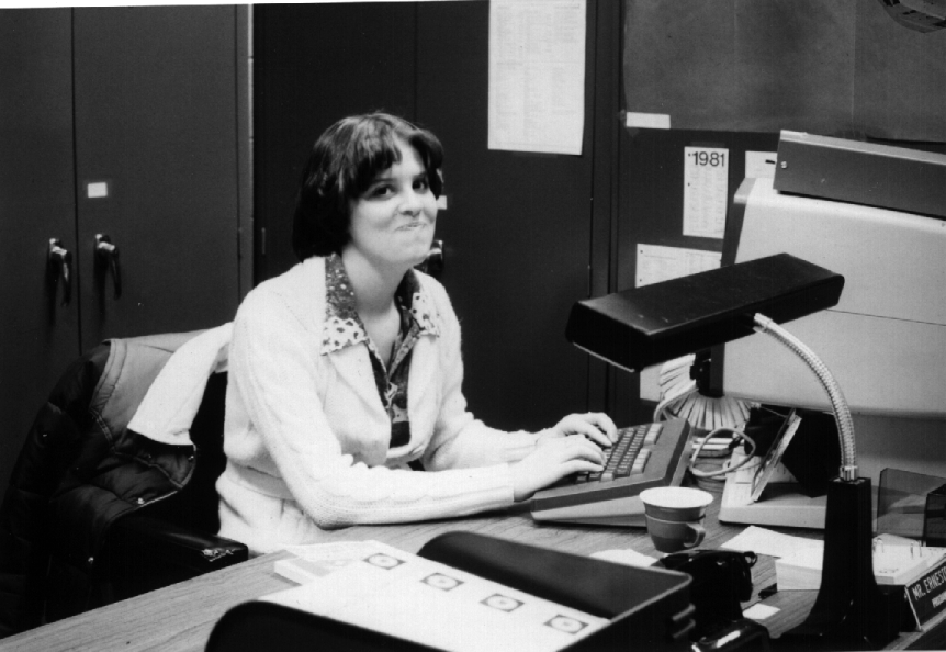 In another staged photo, we find Joyce sitting at Ernie's desk. I'm not sure if she's miffed about having her picture taken or if she was about to burst out laughing for some reason.