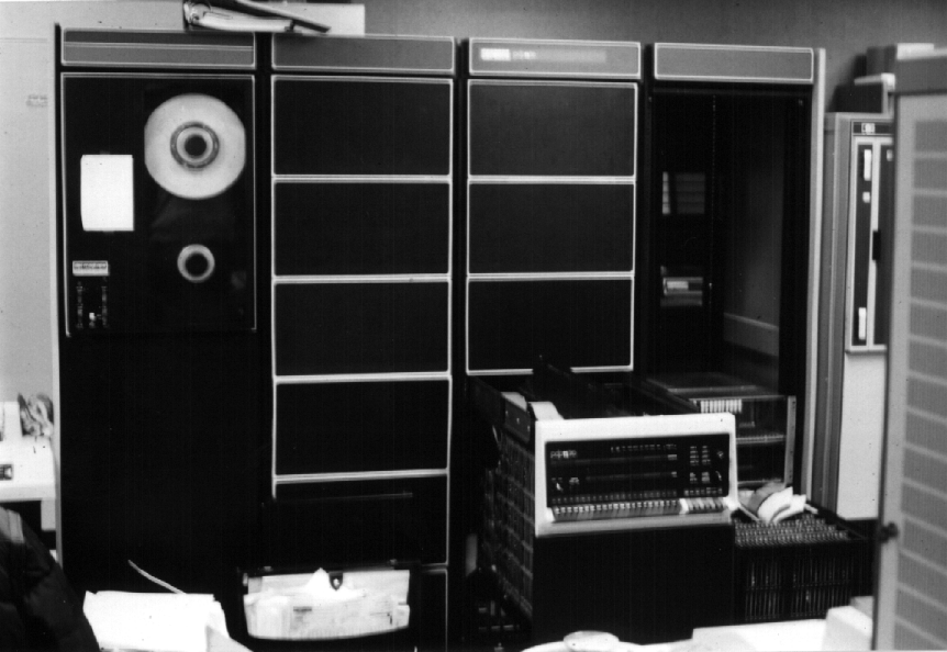 Here is the console and some 9-track tape drives for the Plato system. The Plato computer was a CDC Cyber-173 (?) mainframe. Aron recalls sneaking in a batch FORTRAN job or two before Plato was completely up and running on the machine. Later, the O/S was totally hidden from mere mortals; all access was controlled by the "authoring" language, TUTOR.
