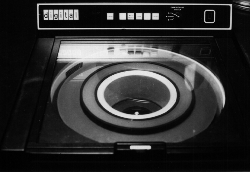 Here is an artfully composed photo showing a section of the Burroughs disk farm. I'd guess you are looking at considerably less storage than what you have in that 3-1/2 inch hard drive in your personal computer. But the appearance leaves no doubt that you have reached the throbbing center of storage control.