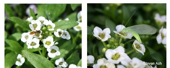 - Annual flowers can be planted in the beds around vegetables. In the Master Gardener Vegetable and Fruit Demonstration Garden (VFDG) at the New Castle County Cooperative Extension Office, sweet alyssum has been planted within vegetable beds for several years to attract and support beneficial insects. Alyssum is inexpensive, easy to grow, low growing and compact (so it doesn’t compete with the vegetables), has a long growing season, and doesn’t leave significant biomass at the end of the season. It can be grown from seed, but at the VFDG plants are typically purchased, for convenience and quick establishment. Numerous syrphid flies (mentioned above) can be seen swarming about the flowers in the spring. Other popular choices are marigolds and nasturtiums. Some popular annual plants such as pansies, however, have been selected primarily for large colorful flowers and may not produce the nectar and pollen needed by beneficial insects.