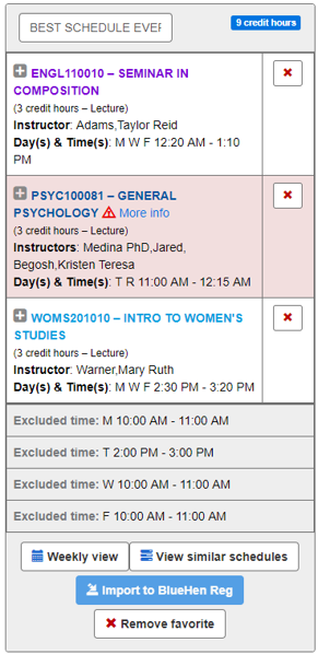 Students can import a schedule directly into WebReg for registration. When ready to import, student can click the “import to BlueHen Reg” button to import the schedule into Webreg.