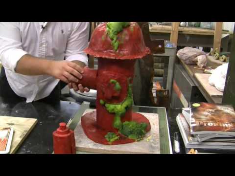 One of his pieces is a red, post-nuclear fire hydrant, with green slime oozing from it.