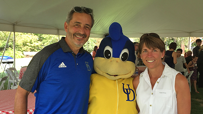 UD President Dennis Assanis and his wife, Eleni, joined the Grassos this year for the event held in the Roselle Center for the Arts Courtyard. Despite the intense heat and humidity, more than 100 faculty and family members attended, along with University mascots YoUDee and Baby Blue, who were not shy about mingling with guests and posing for photos.