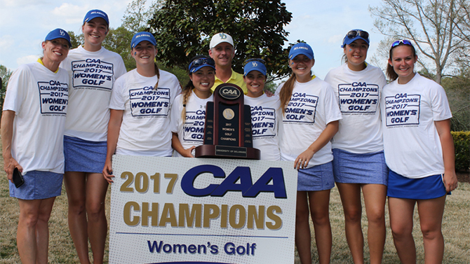 The University of Delaware women’s golf team fired its second consecutive 295 score on Sunday, April 16, as the Blue Hens cruised to an 11-shot victory to successfully defend their Colonial Athletic Association championship and secure another trip to the NCAA Regionals.