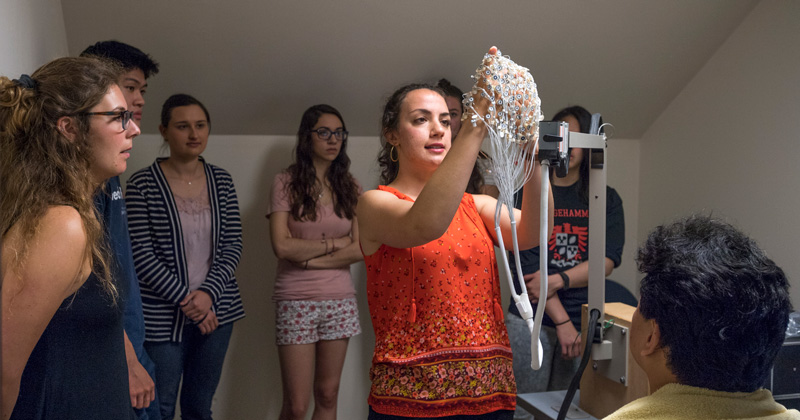 The latter topic took the students to professor Jim Hoffman’s EEG lab, where research subjects donned netlike caps to record the brain’s electrical activity. The students learned what various methods of processing those electrical signals could reveal about how the brain functions.