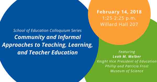 The University of Delaware School of Education (SOE) colloquium series on “Community and Informal Approaches to Teaching, Learning, and Teacher Education” continues on Wednesday, Feb. 14 with a presentation on “From ‘Reddit’ to Reality: Our Informal Connections with Nature” from Leah M. Melber, Knight Vice President of Education at the Phillip and Patricia Frost Museum of Science.