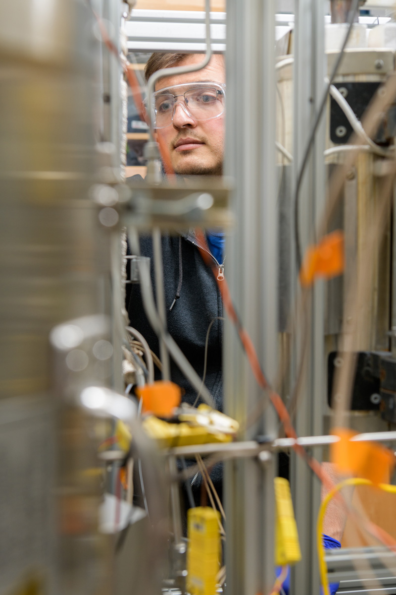 When Xu joined UD, he shelved his thermochemical water splitting work and focused his research efforts on other projects in catalysis and renewable energy. However, his three-step thermochemical water splitting process intrigued doctoral student Casper Brady. Brady, who joined UD in 2015 after receiving a bachelor’s degree from New Mexico Institute of Mining and Technology, is particularly skilled at reactor engineering — building the systems where chemical reactions take place. Brady sensed that he could develop a reactor that was more productive and efficient than previous iterations.