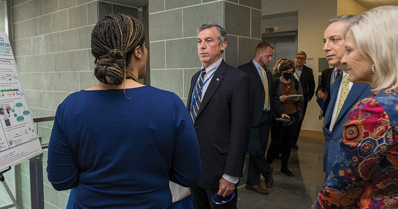 Sullivan, who is also the Alvin B. and Julie O. Stiles Professor of Chemical and Biomolecular Engineering, then led Carney and guests on a tour of facilities in Colburn and ISE to meet faculty and students. The tour highlighted the department’s emphasis on collaborative projects and how faculty and student researchers are building upon the department’s industry-driven origins to make UD a driver of tech transfer, innovation and job creation for the region.